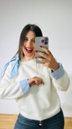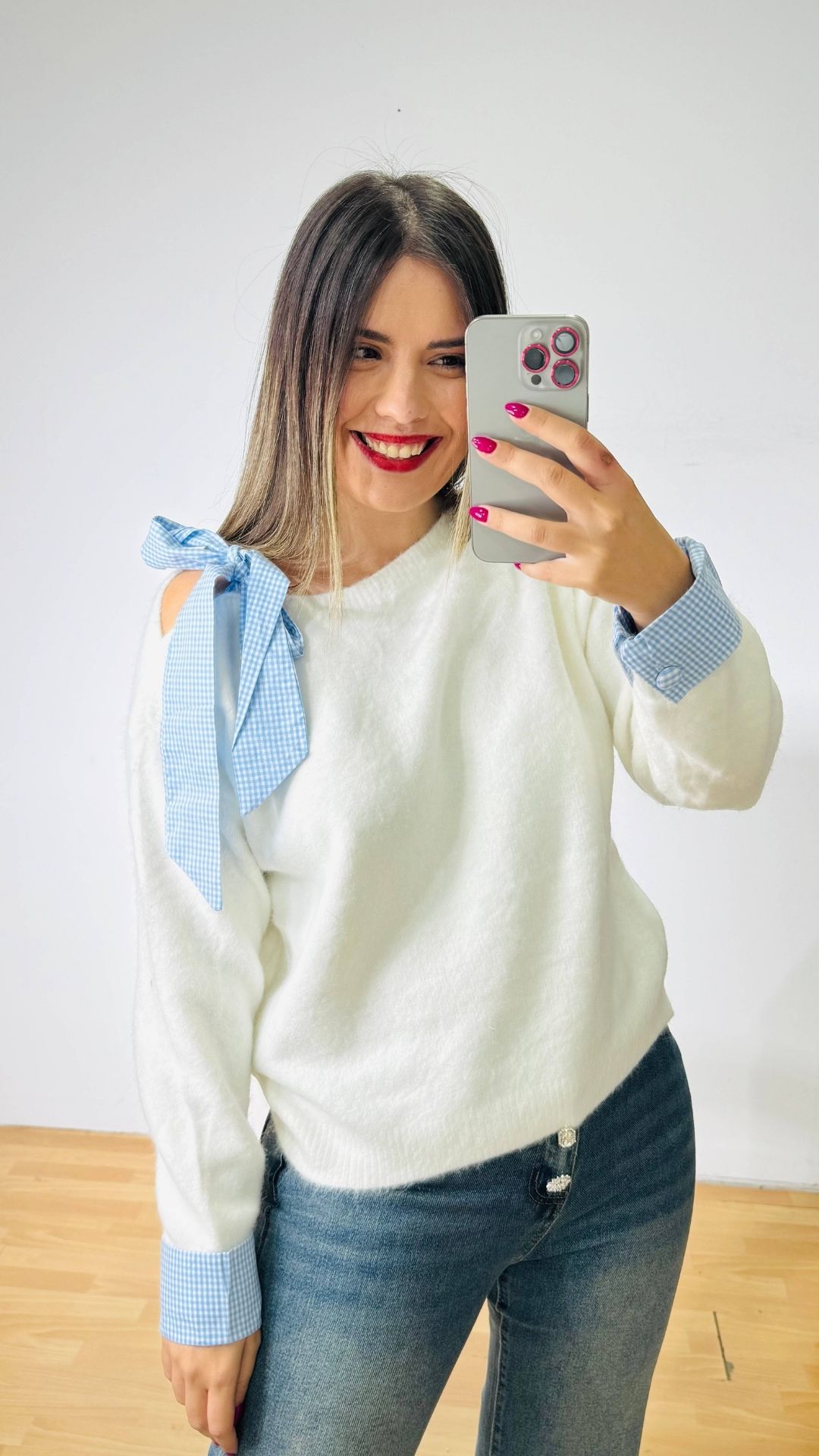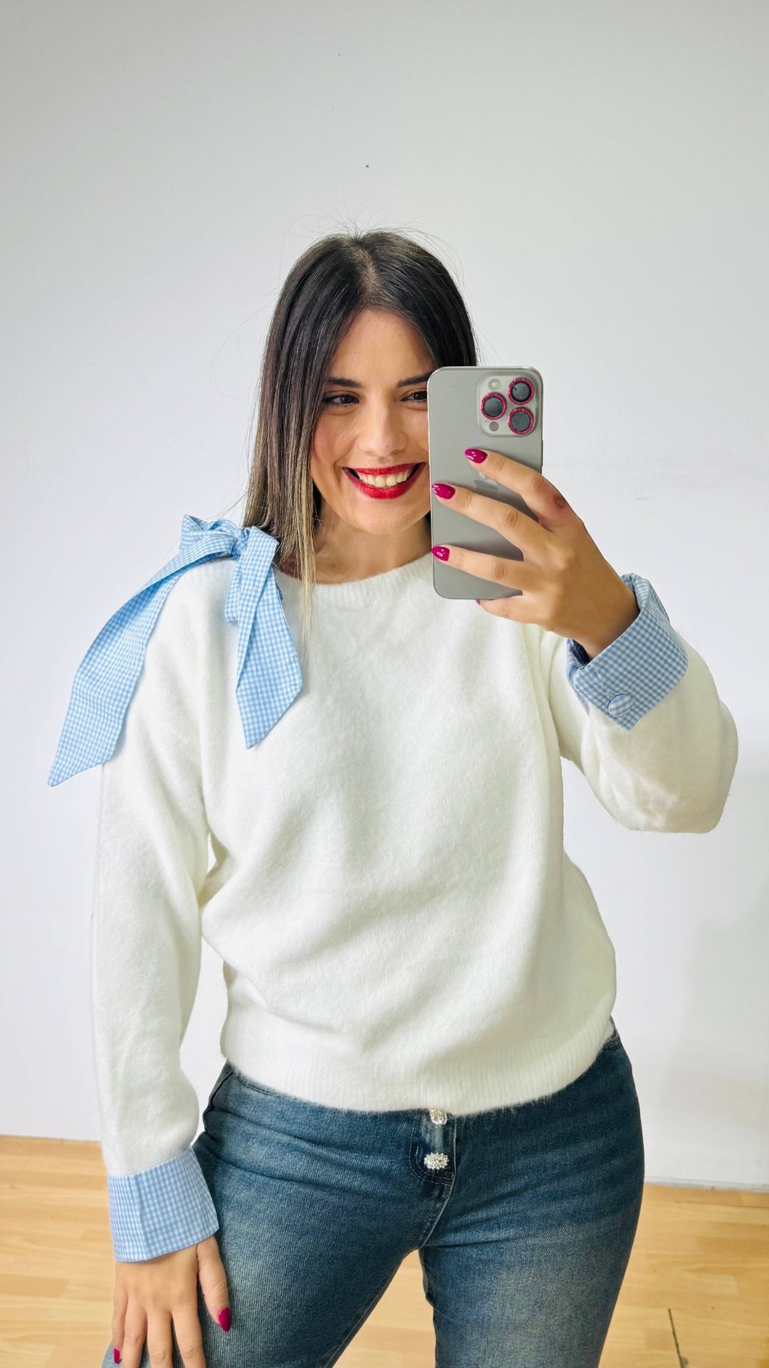 Πουλοβεράκι μοχέρ με χαμόγελο και ραμμένο καρό φουλάρι στον έναν ώμο και ασορτί βαμβακερή καρό μανσέτα.