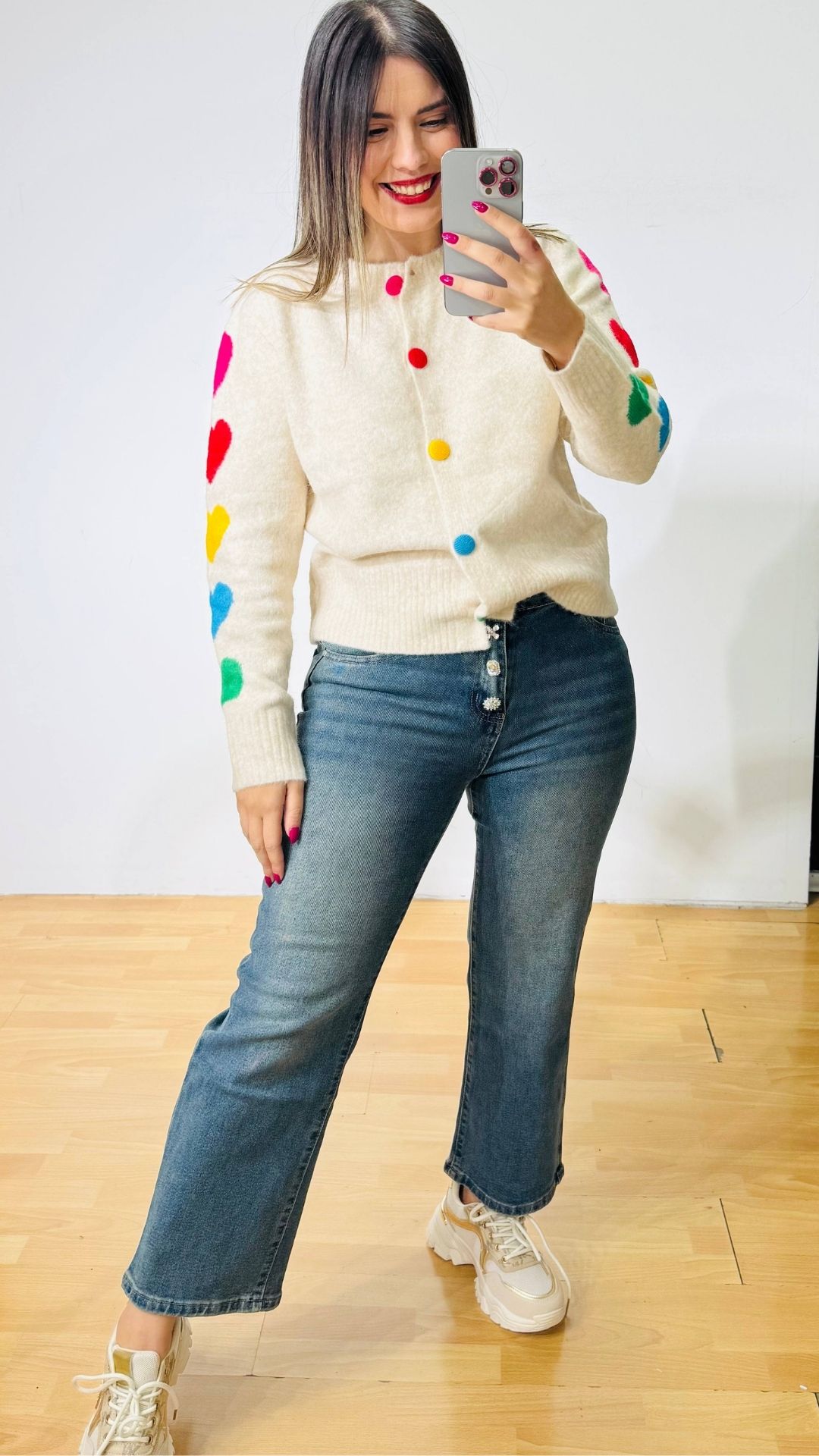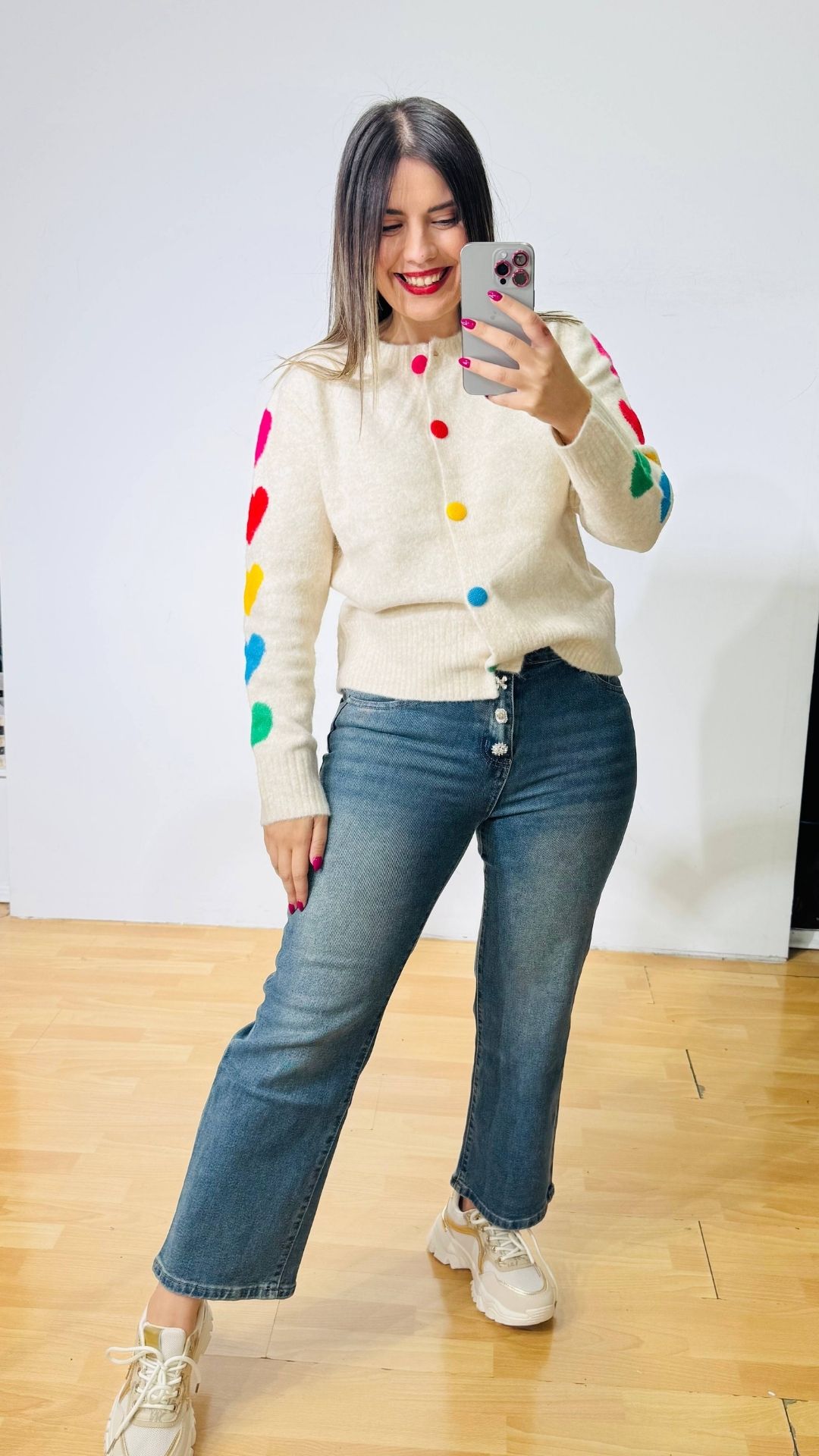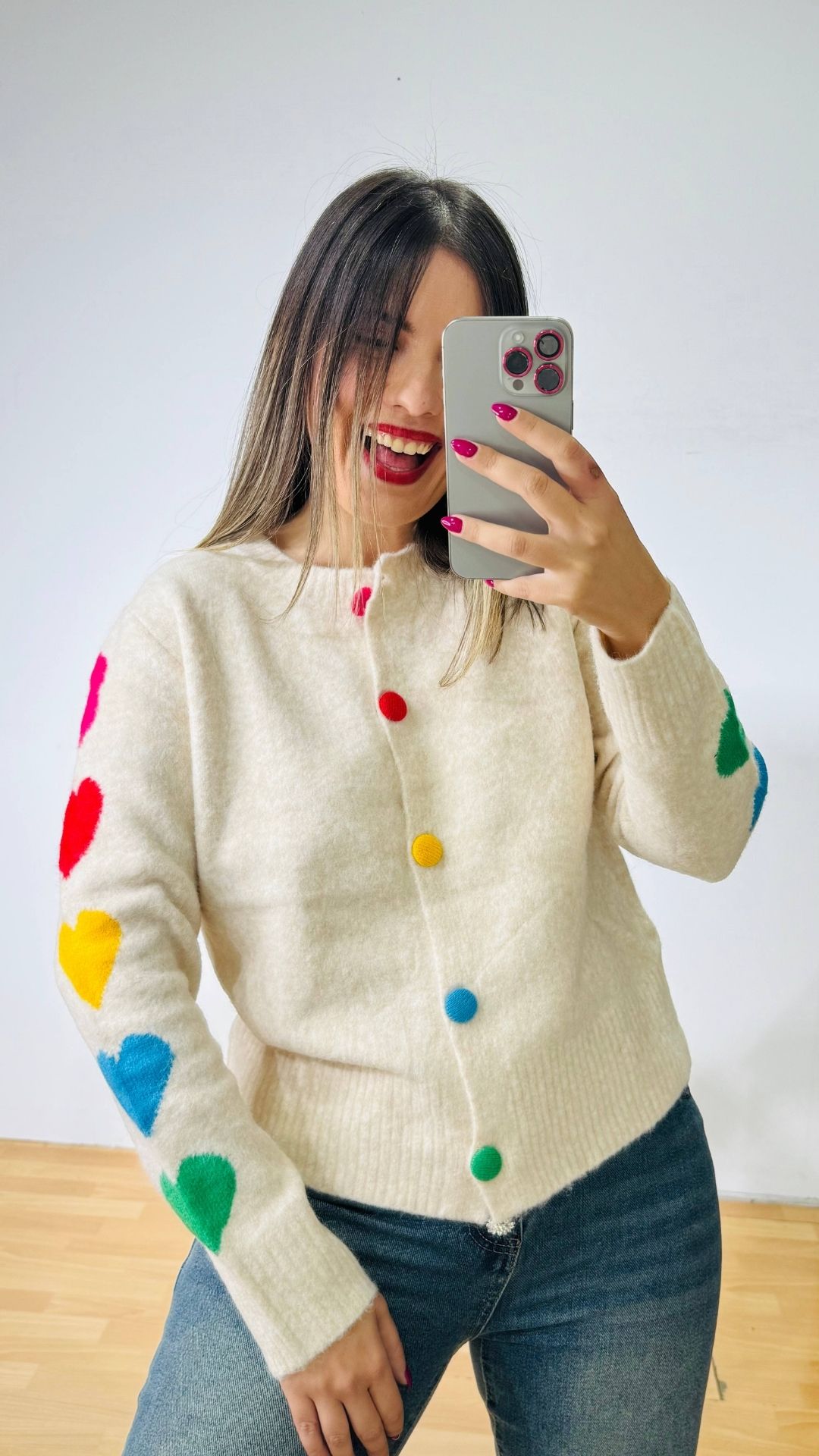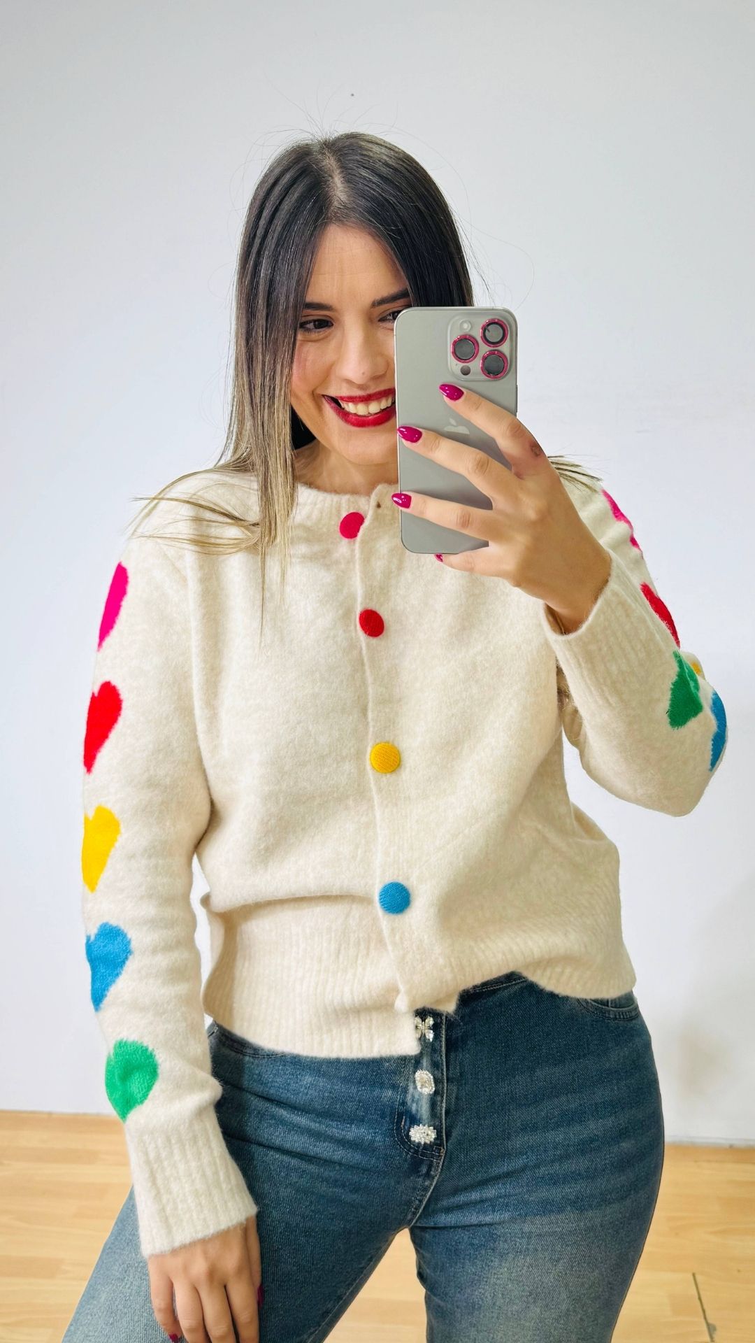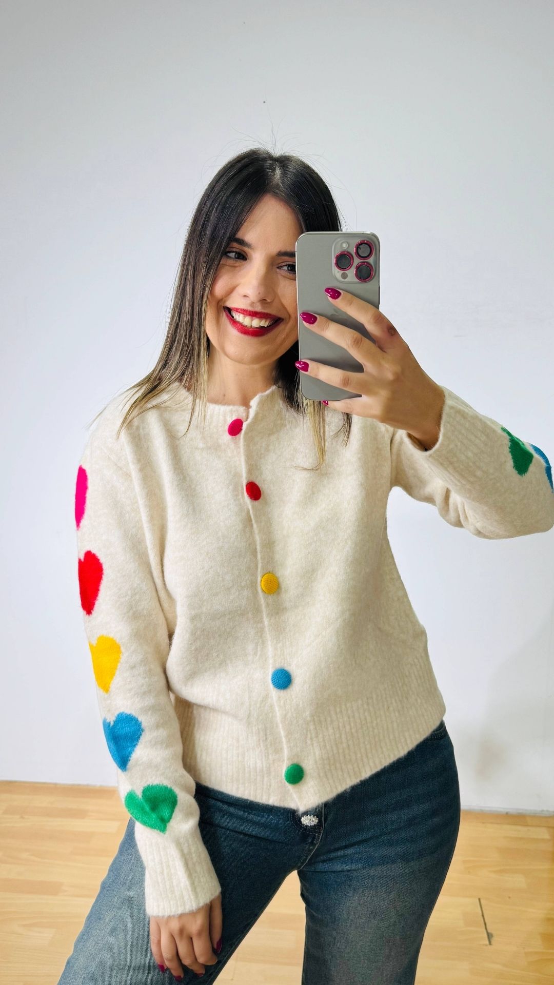 Ζακέτα -πουλοβεράκι με πολύχρωμα κουμπιά και πλεκτές πολύχρωμες καρδιές στο μανίκι, μέσα στην ύφανση