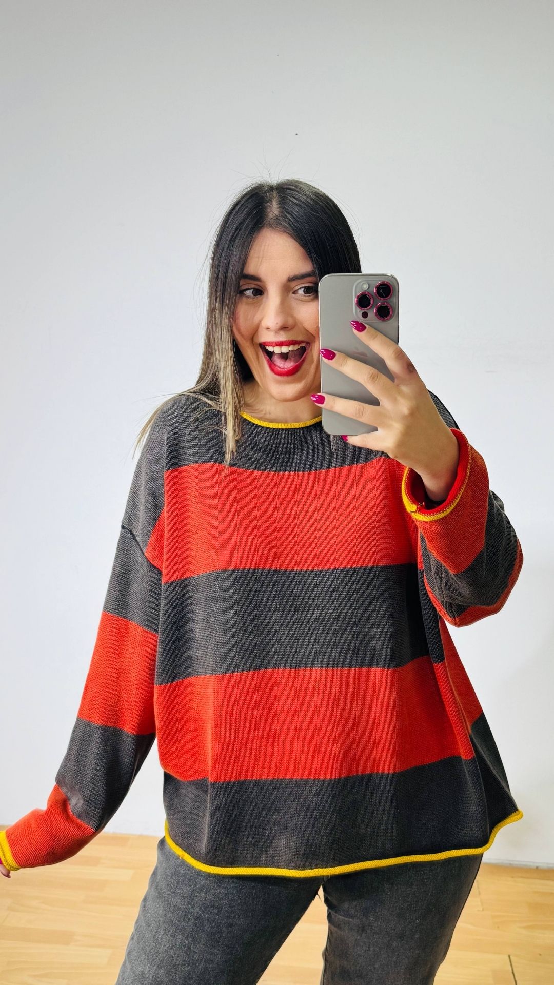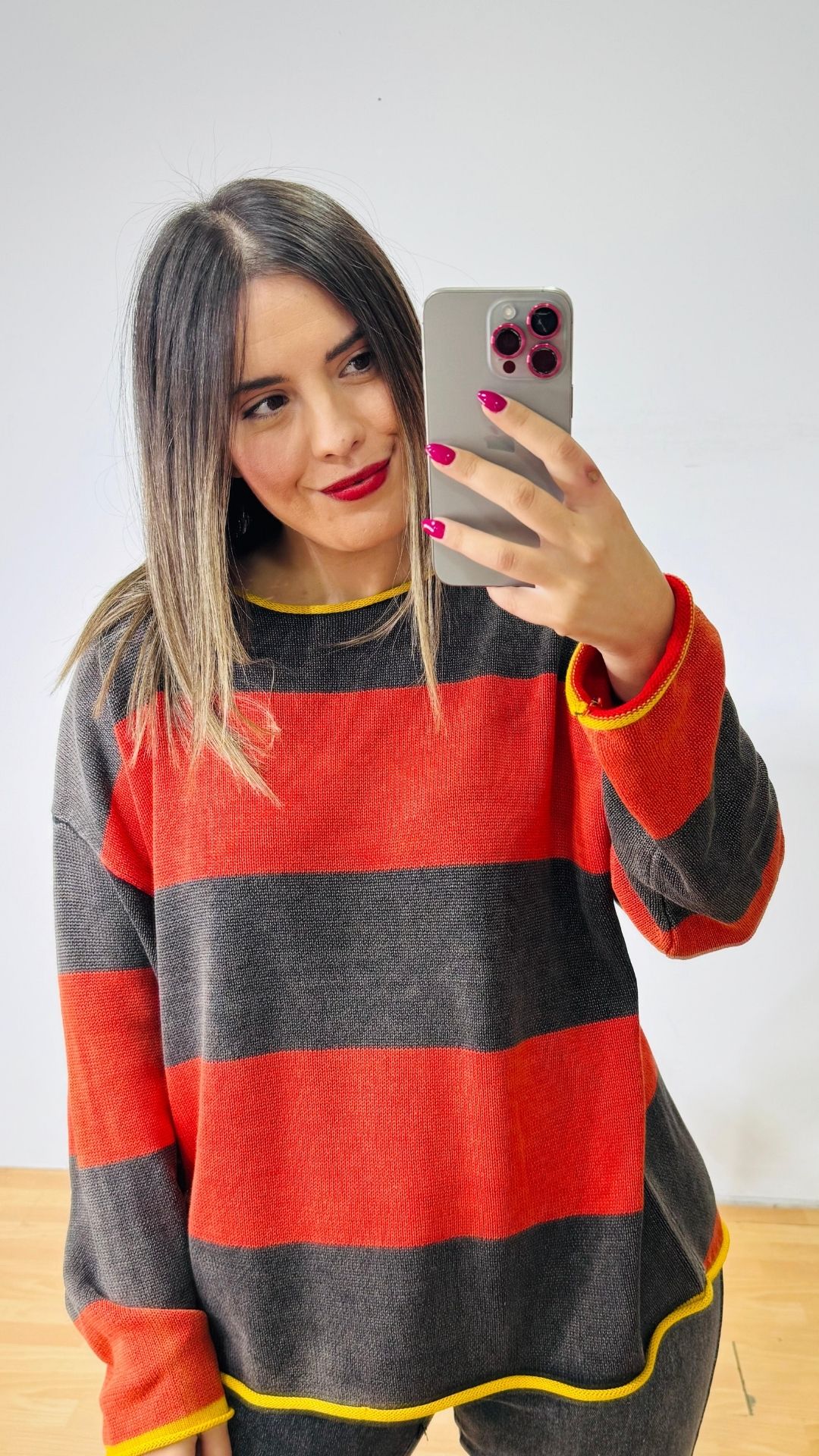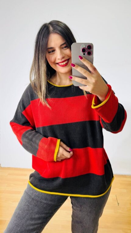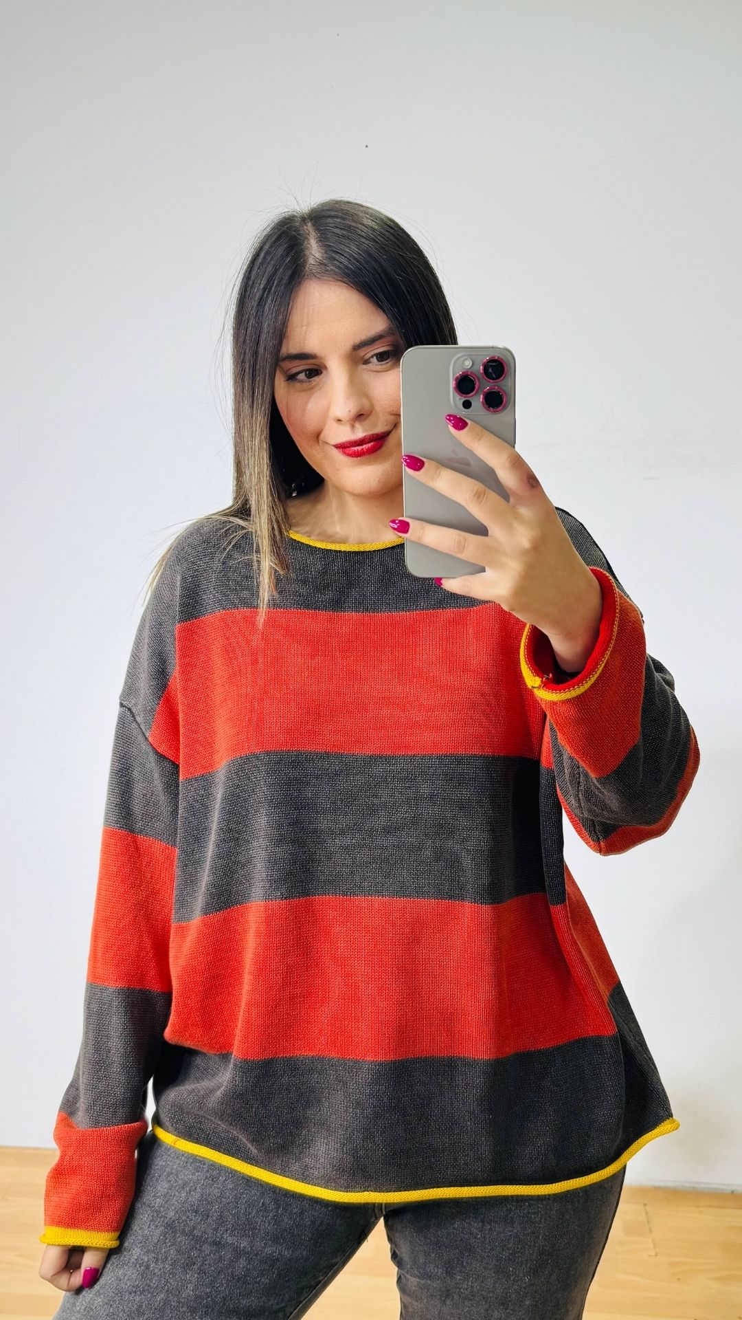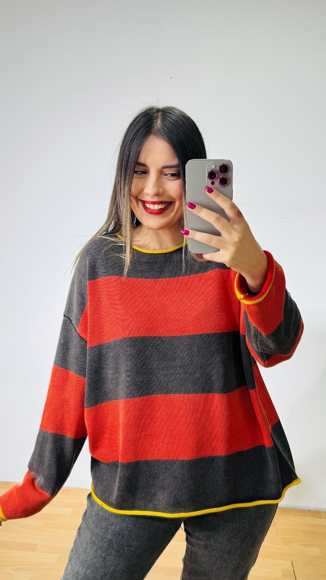 Πλεκτό Πουλόβερ Μαρινιέρα σε αποχρώσεις κόκκινο-γκρι πετροπλυμμένο