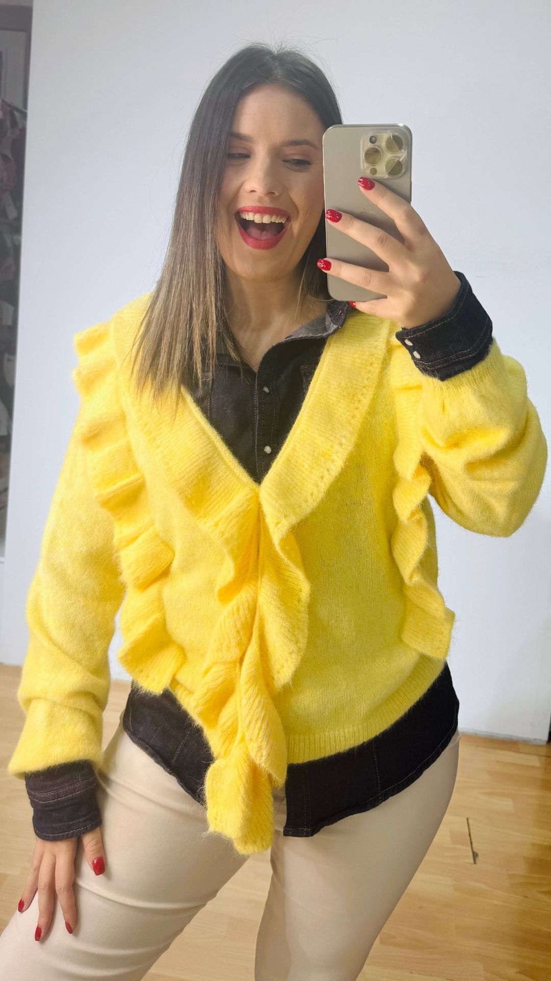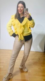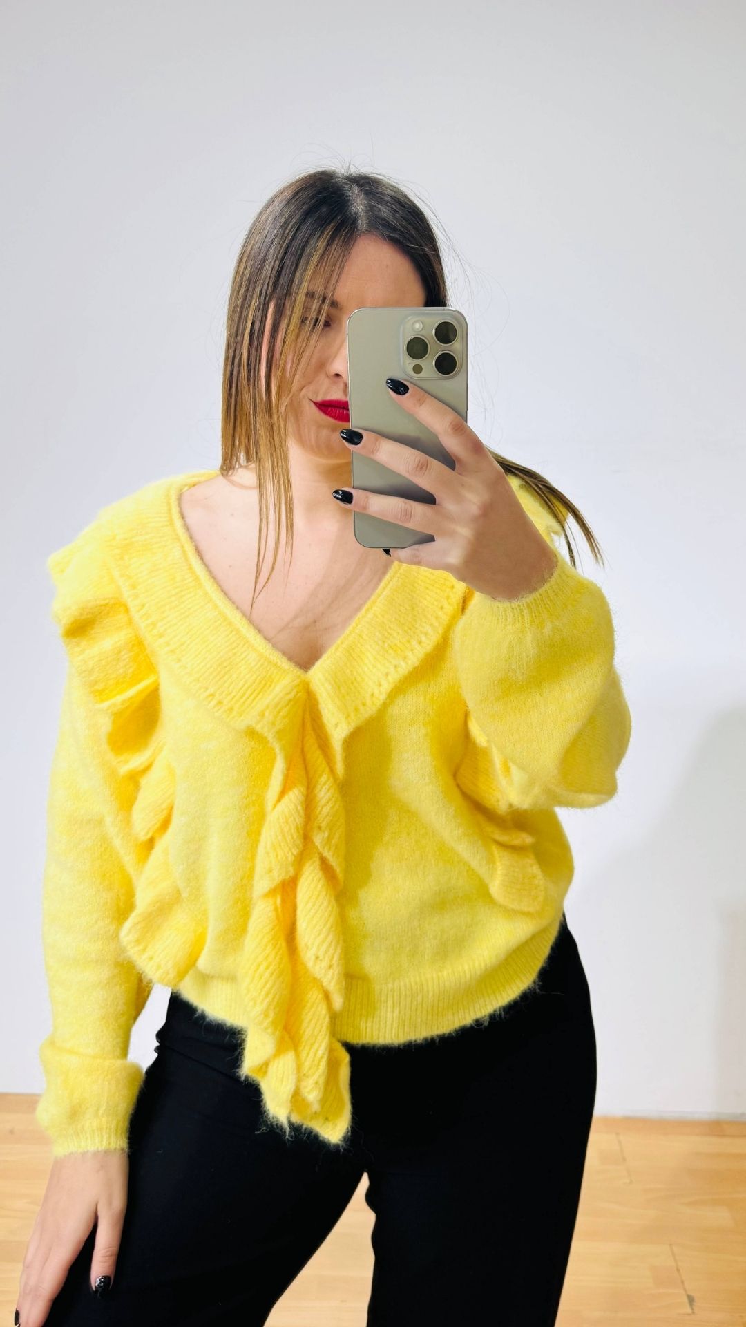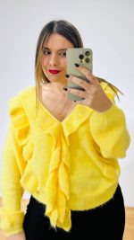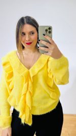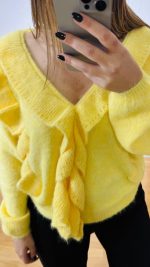 Πλεκτό πουλοβεράκι πολύ μαλακό με βαθυ ντεκολτε. Ενσωματωμένο βολάν στην μπροστινή όψη