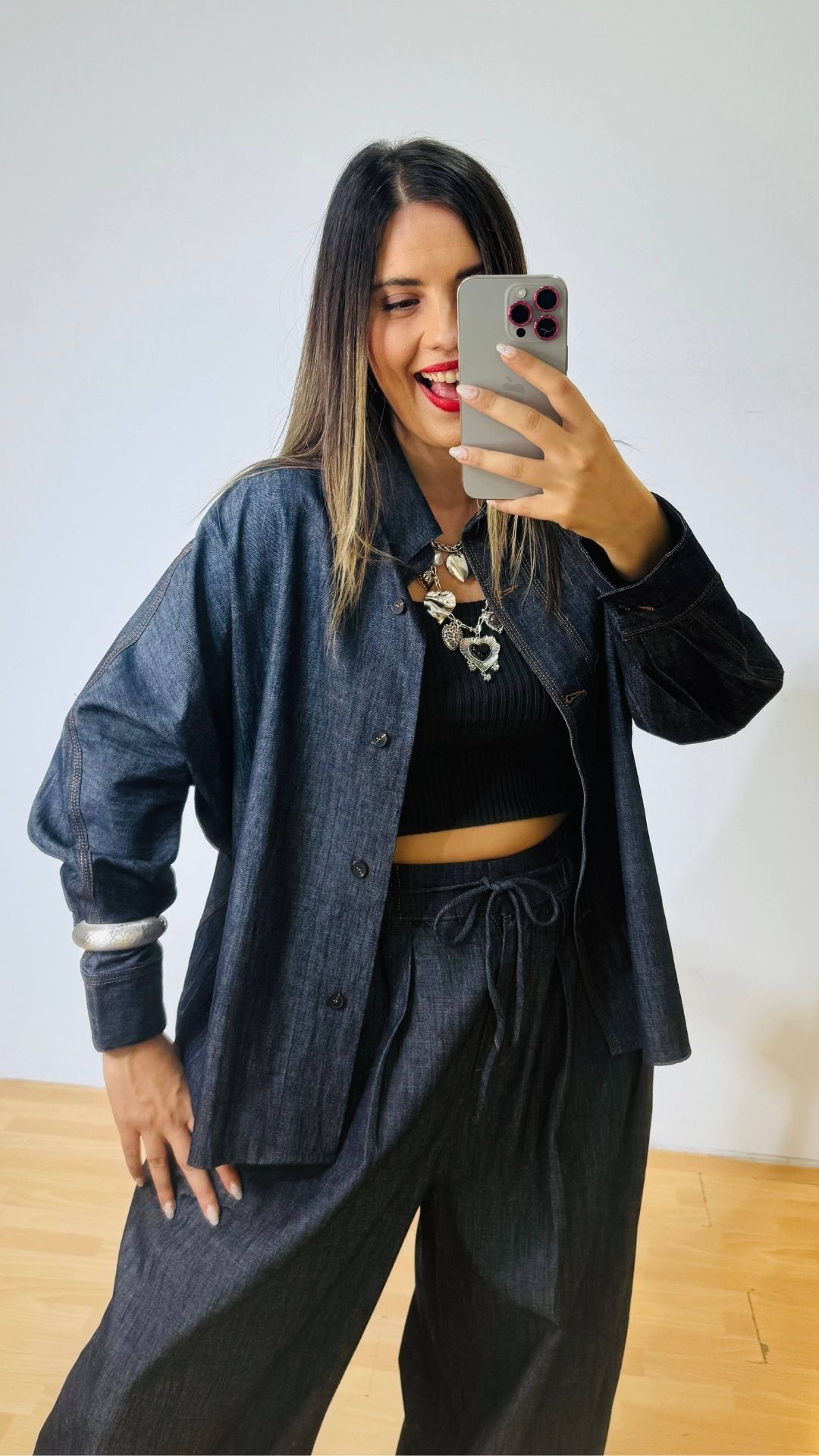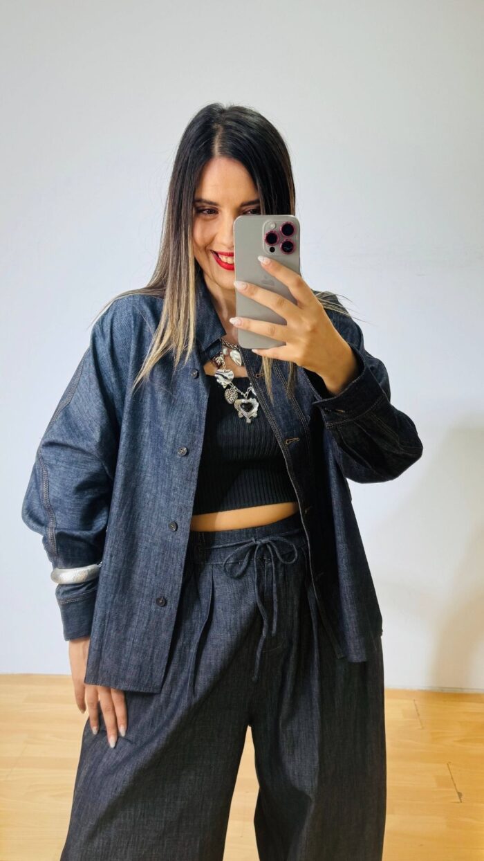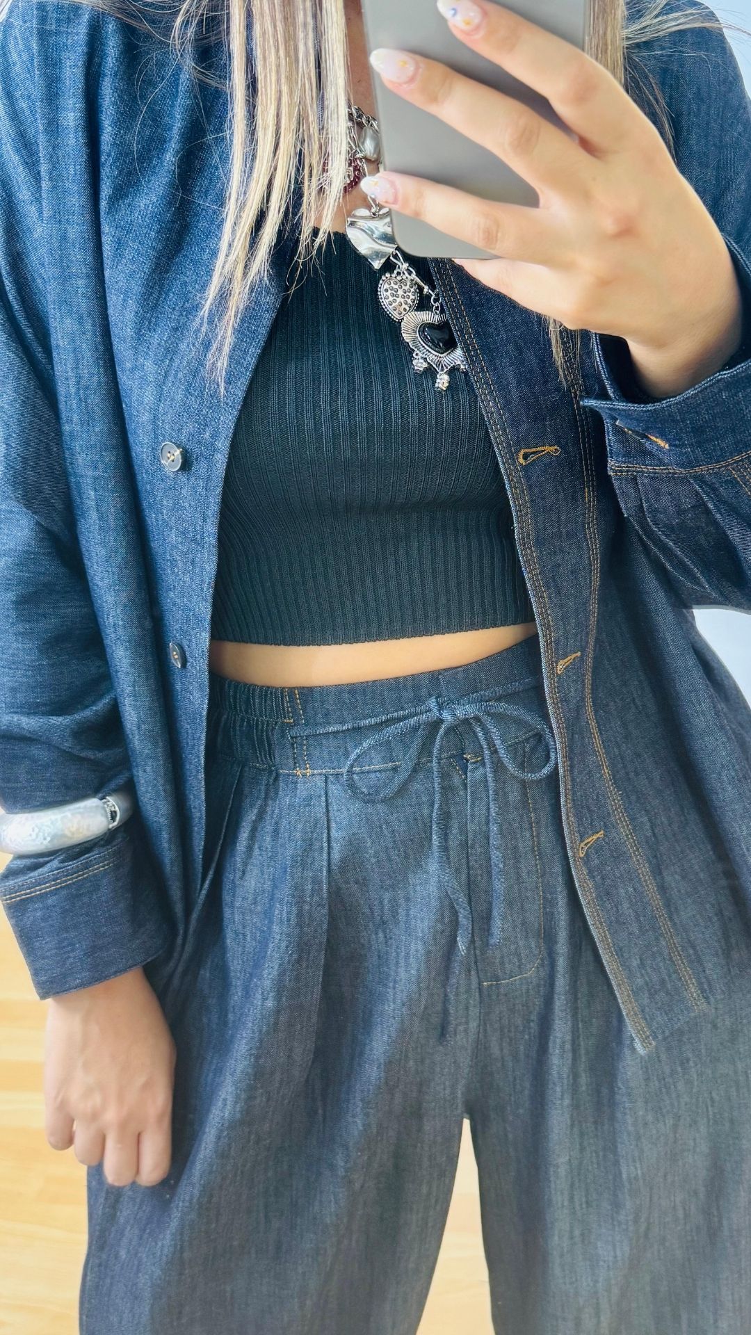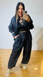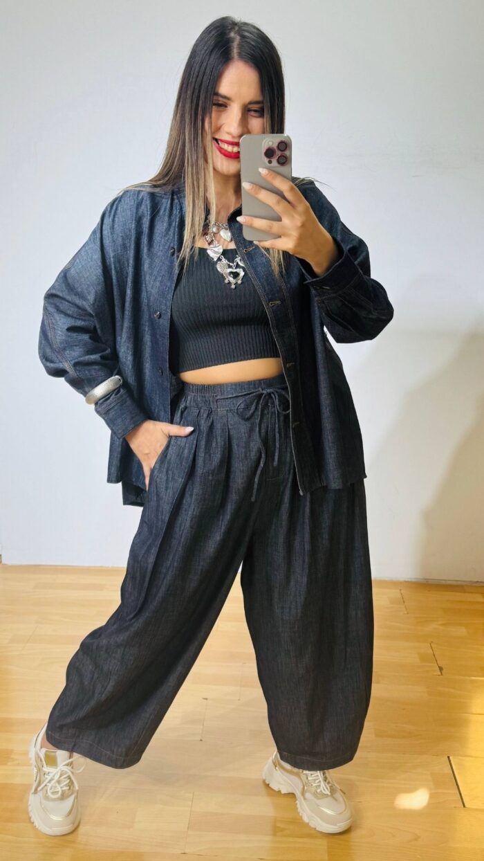 Βαμβακερό Σετ Denim – Αποτελείται από πουκαμίσα με νυχτερίδα μανίκια, κλείνει με κουμπιά & Παντελονα τύπου σαλβάρι με λάστιχο στην μέση, πλαινές τσέπες, κλείνει με κουμπί και φερμουάρ.