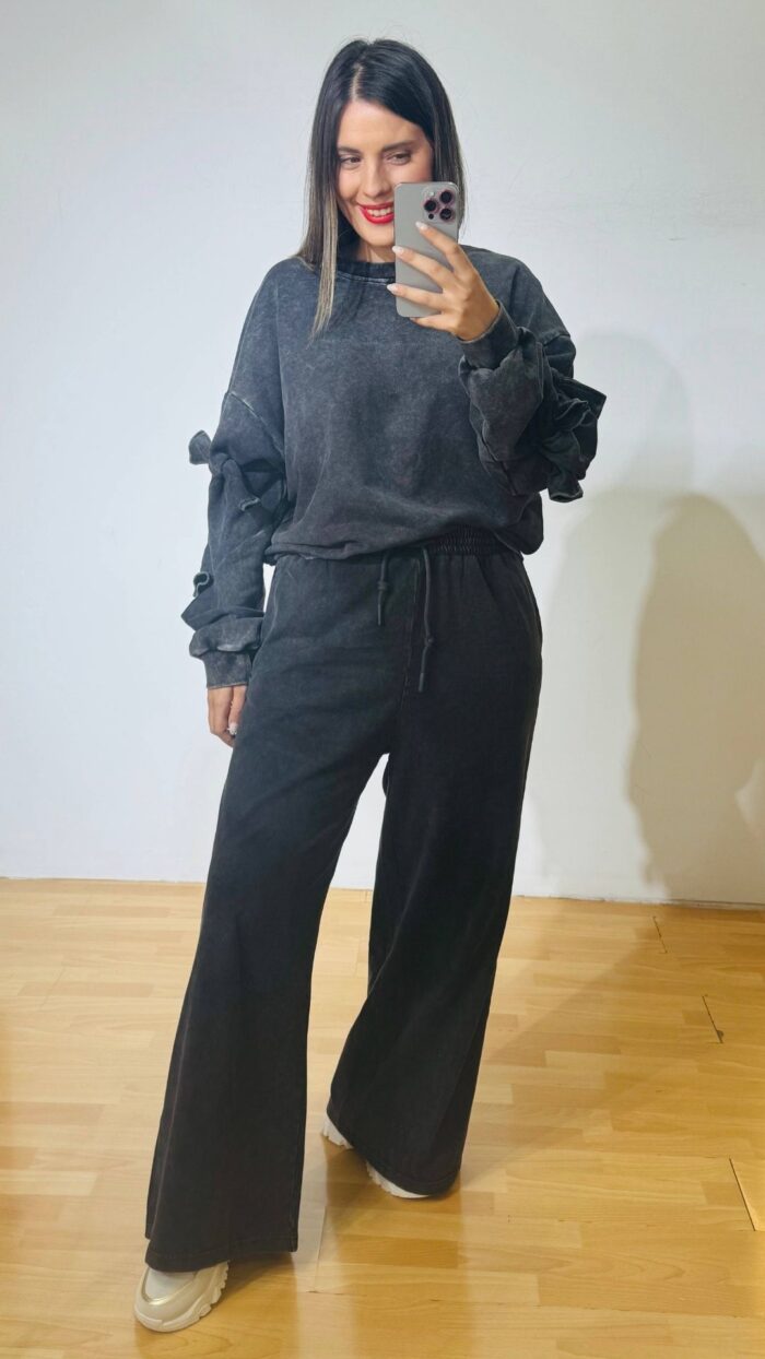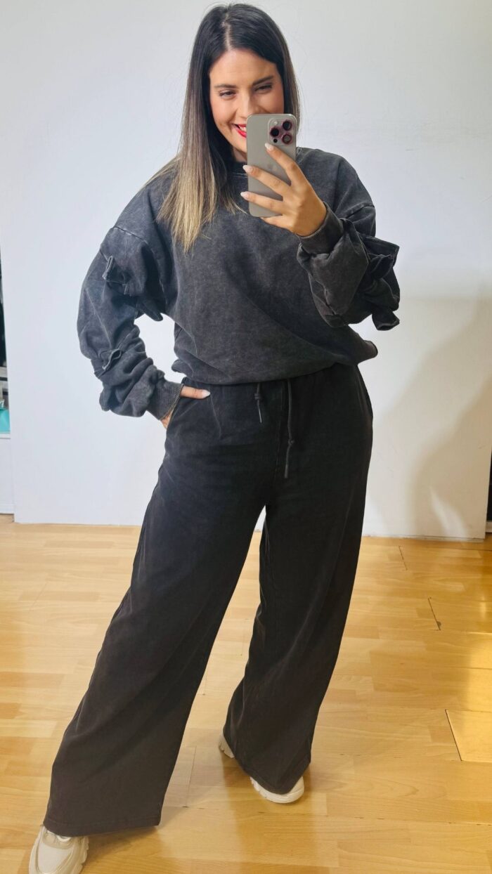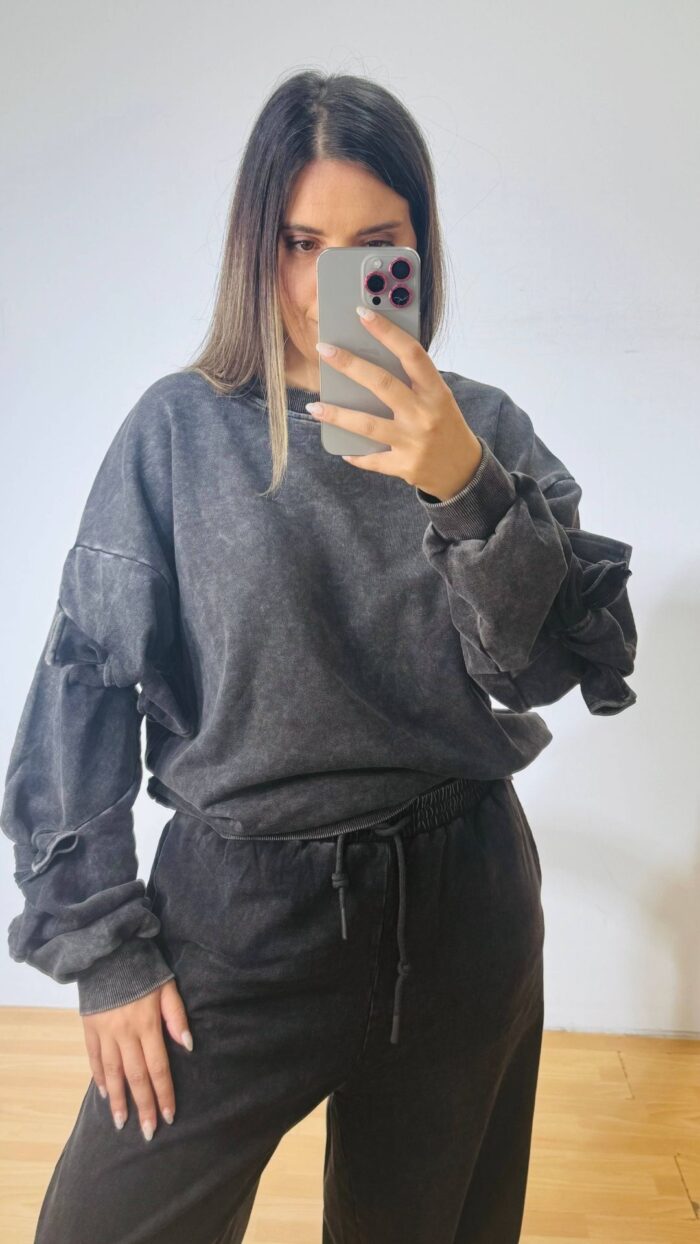 Σετ φούτερ πετροπλυμμενο που αποτελείται από ψηλόμεση παντελόνα με λάστιχο στην μέση, ρυθμιζόμενο κορδονάκι και πλαινές τσέπες & Μπλούζα φούτερ με ιδιαίτερα δεσίματα στα μανίκια