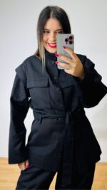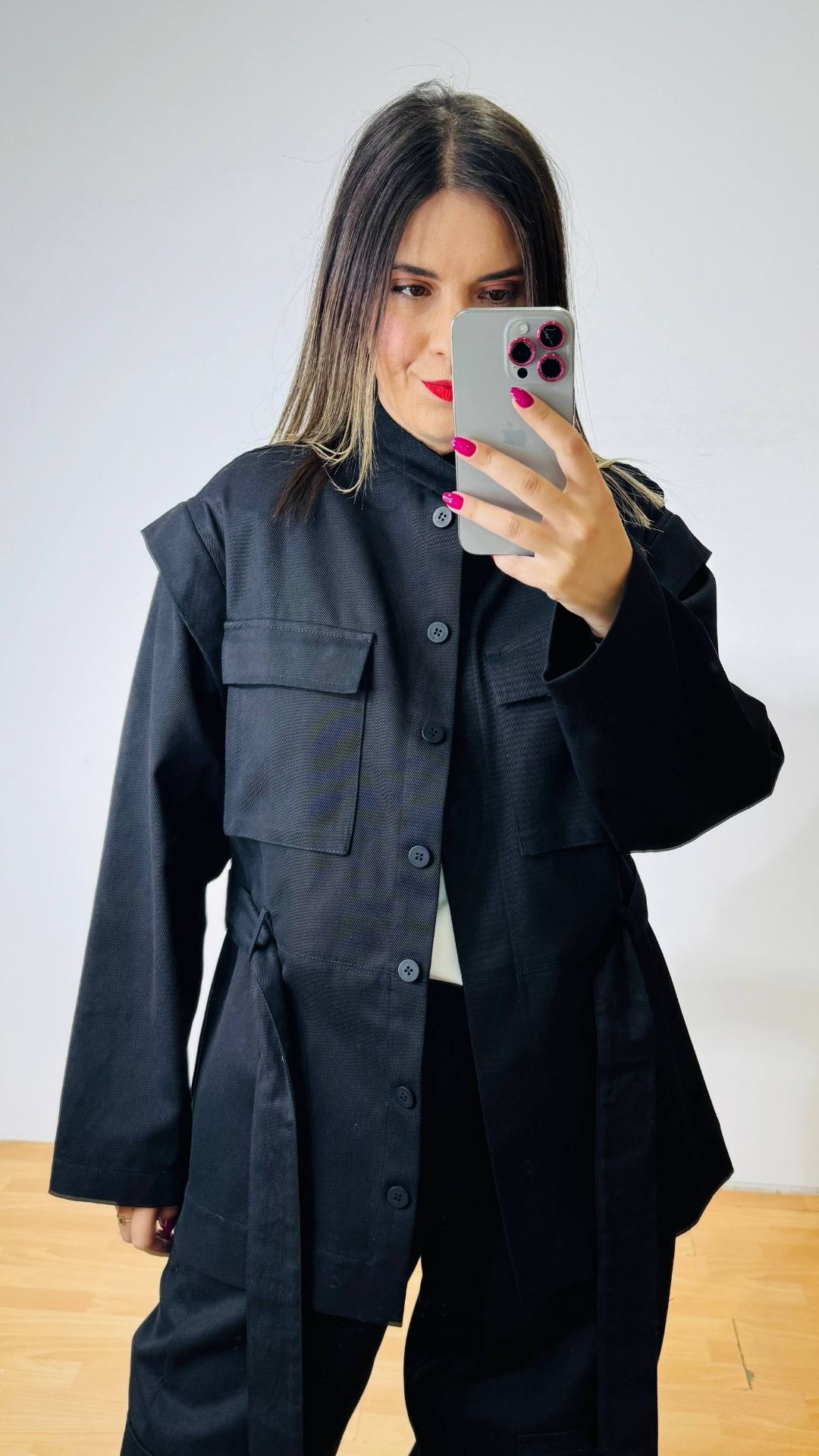 Jacket Army με ασορτί αποσπώμενη ζώνη ,κλεινει με κουμπιά και πατιλέτα , τα μανίκια αφαιρουνται με κρυφό φερμουαρ για να γινει αμάνικο jacket