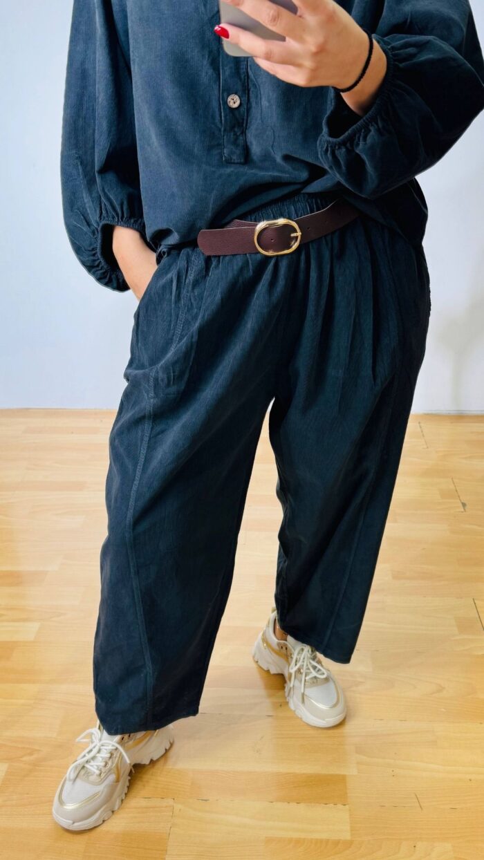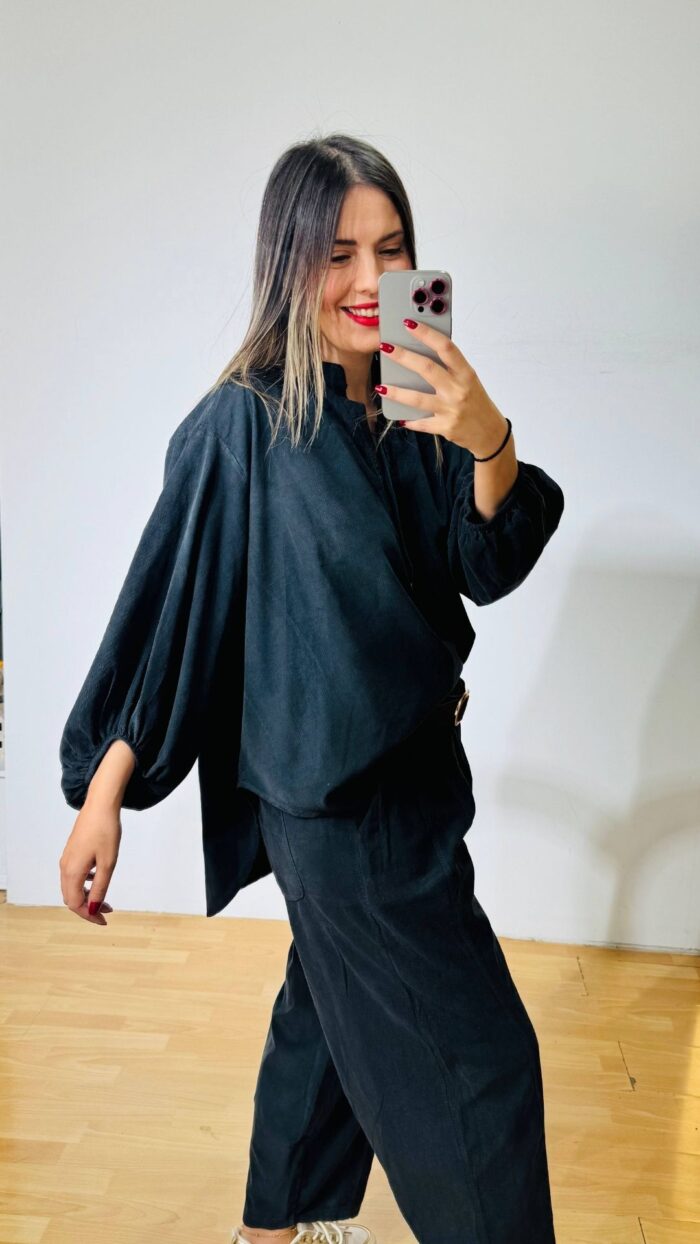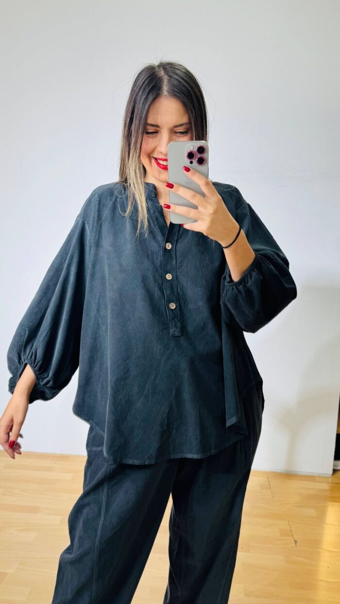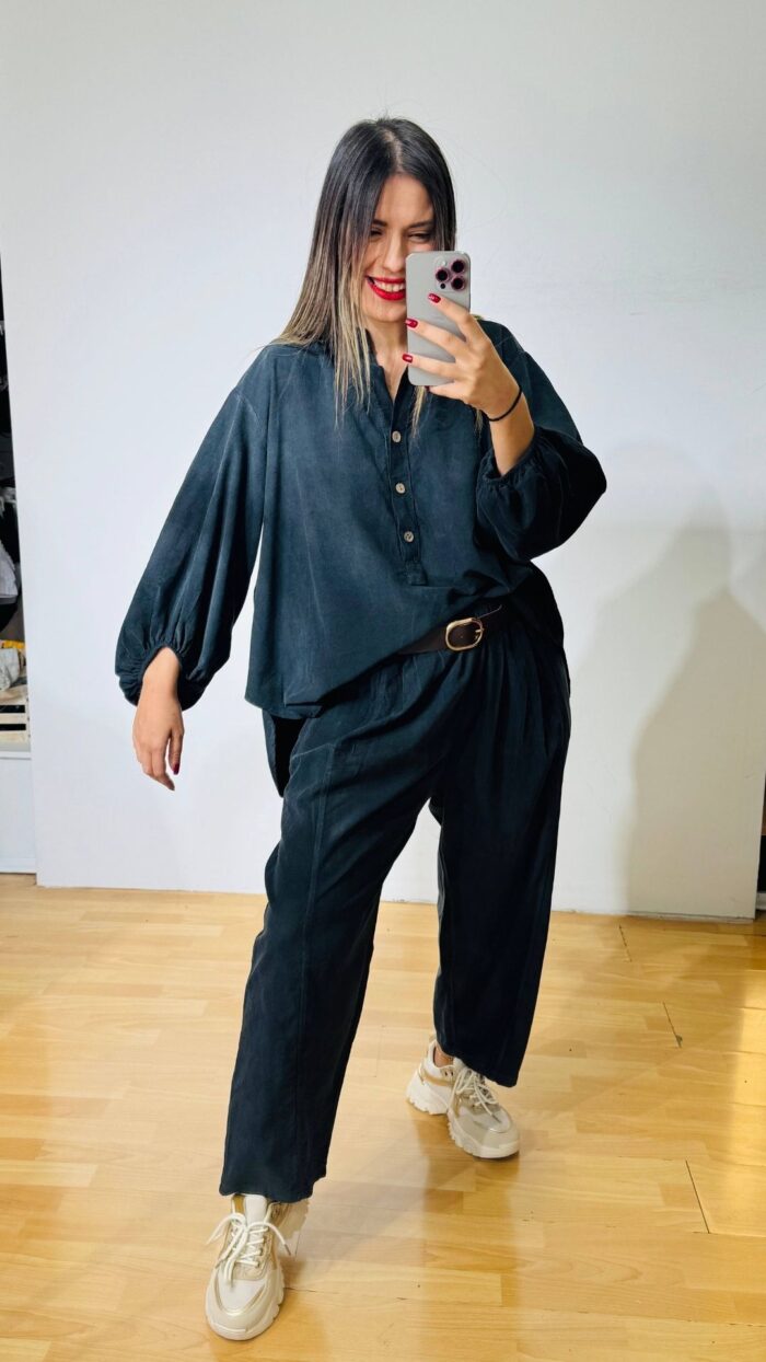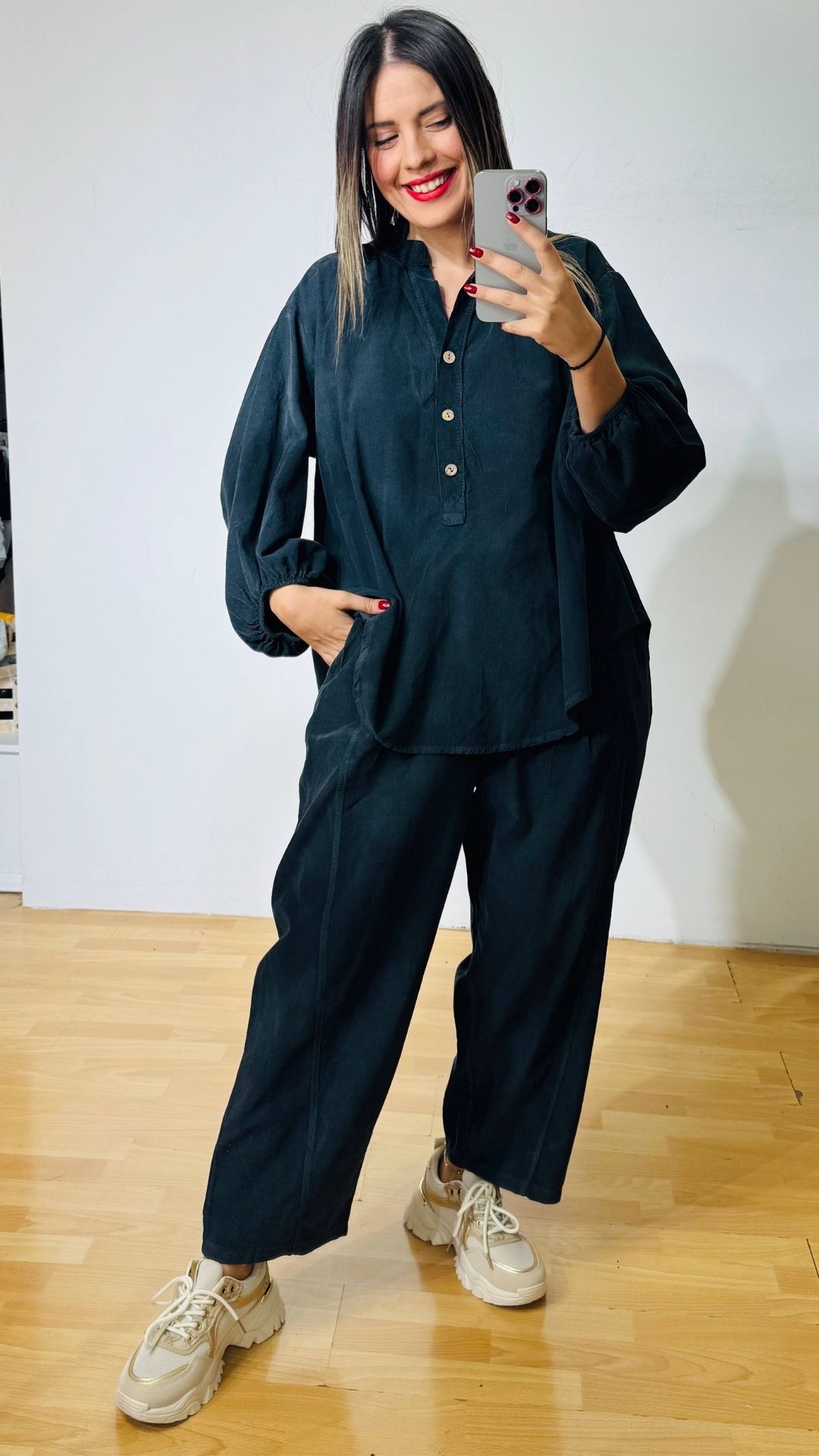 Σετ κοτλέ Αποτελείται από πουκαμίσα με μάο γιακά και κουμπάκια σε άνετη γραμμή & Παντελόνι τύπου σαλβάρι με λάστιχο στην μέση, πλαινές τσέπες.