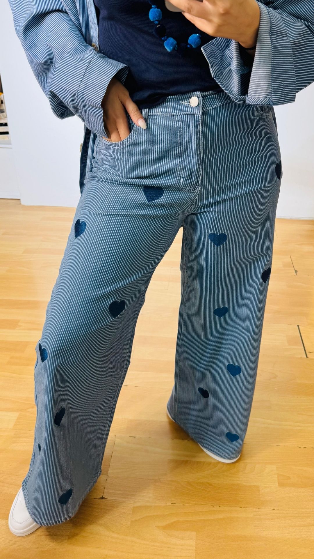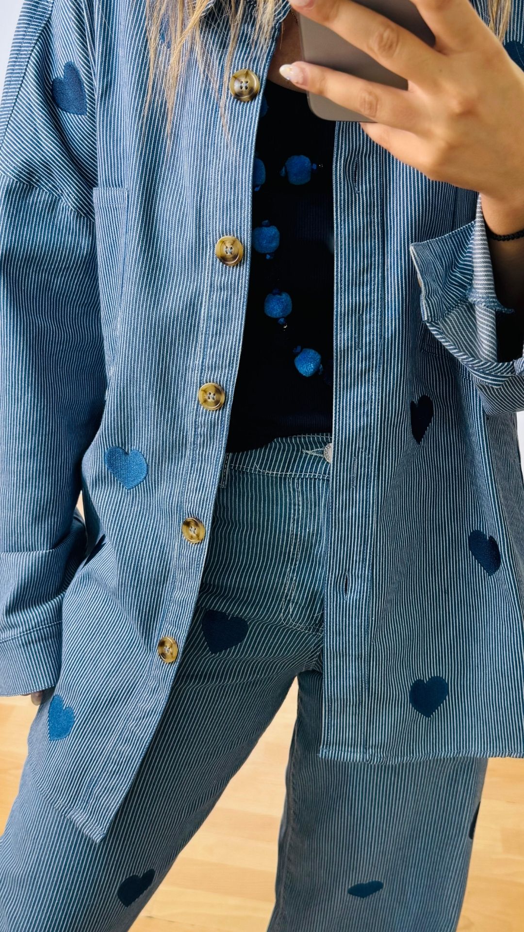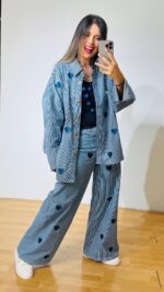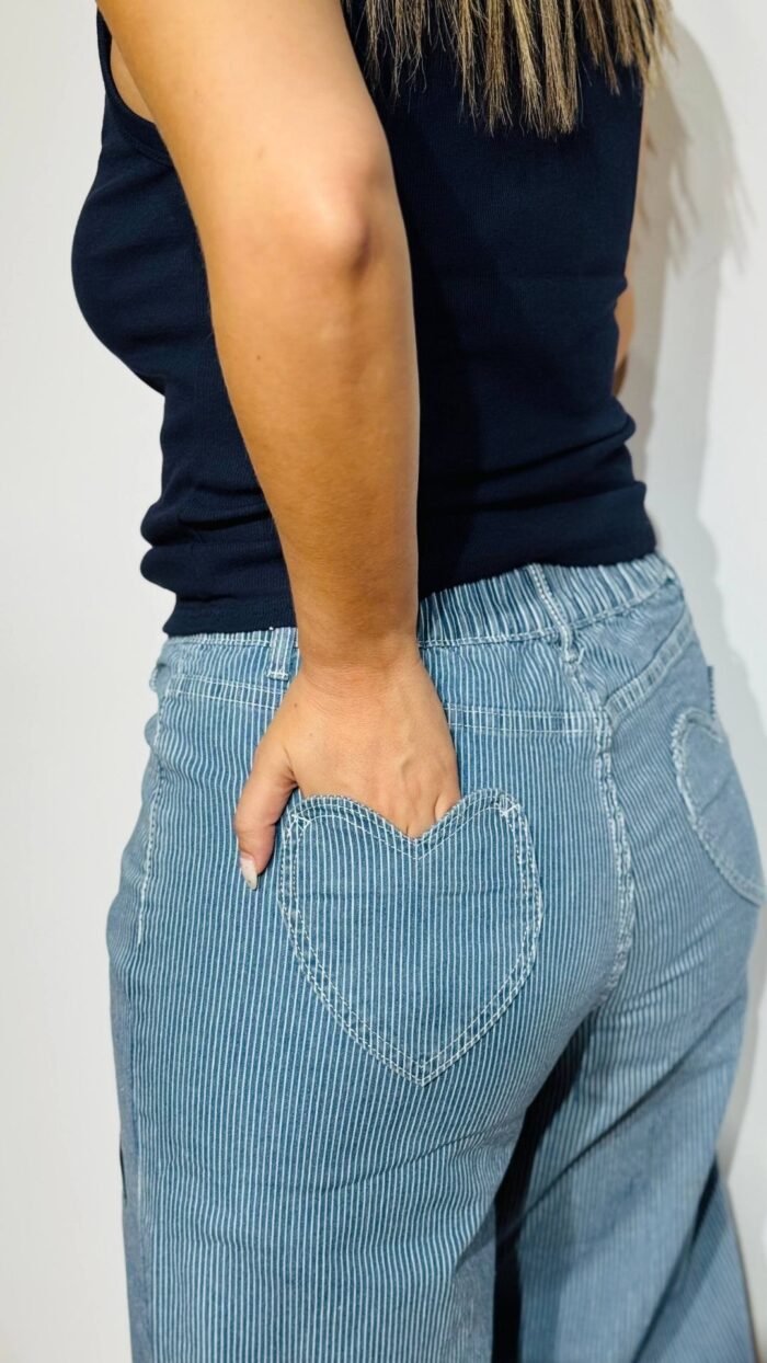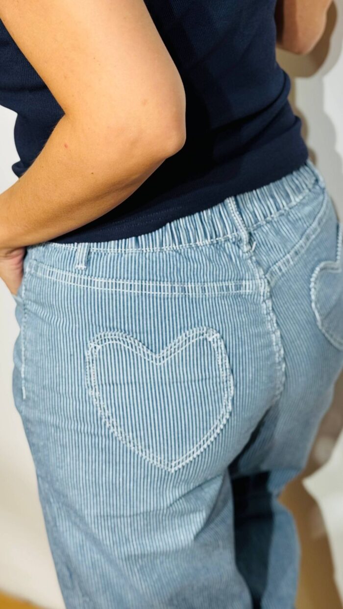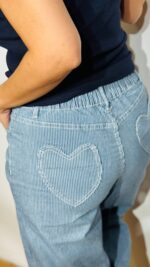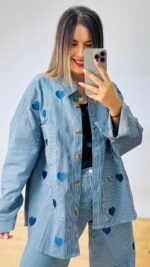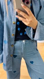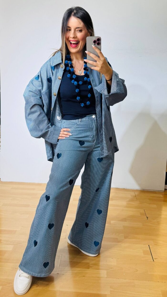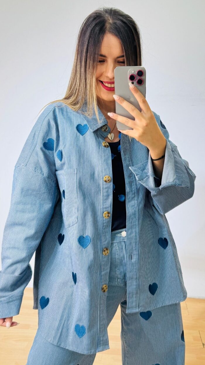 Σετ denim βαμβακερό με ελαστικότητα -ριγέ με κεντητές καρδούλες. Αποτελείται από παντελόνι με λάστιχο στο πίσω μέρος της μέσης, πεντάτσεπο με σχέδιο καρδιά στο πίσω μέρος, κλεινει με κουμπί και φερμουάρ  και Jacket-Πουκαμίσα σε loose γραμμή, κλείνει με κουμπιά